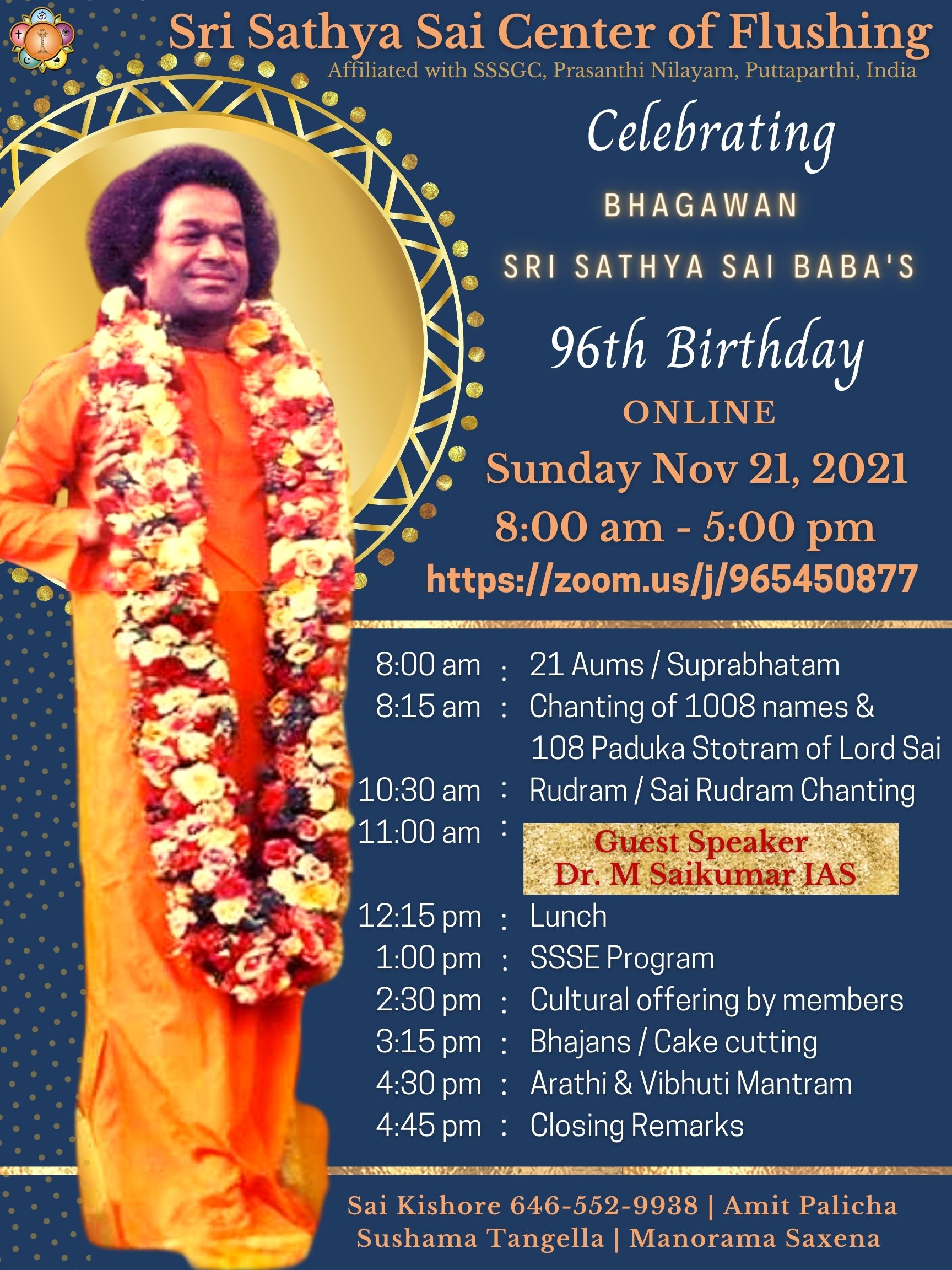 Flushing Sai Center is cordially inviting one and all for celebration of our beloved Bhagawan Sri Sathya Sai Baba’s 96th Birthday.